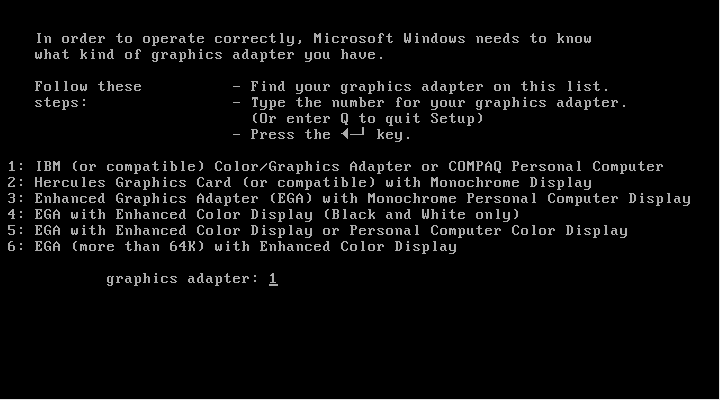 以下图片为Windows 1.0在MS-DOS 5.0下的安装界面。当时最好的显卡也就是EGA(Enhanced Graphic Adapter,增强型图形适配器),64KB显存,640x350的分辨率,16色。